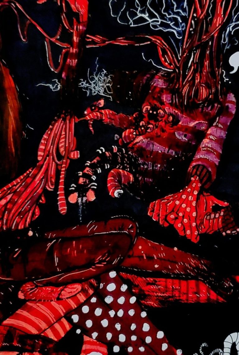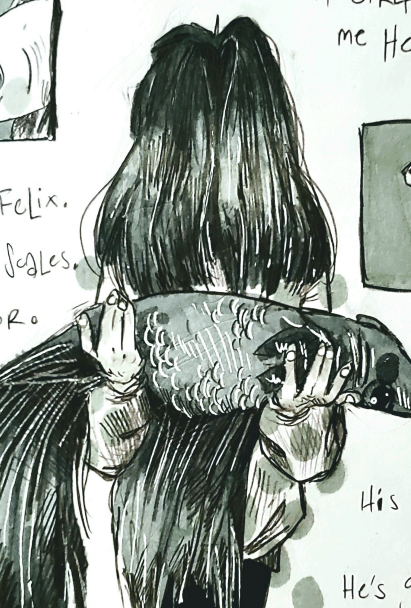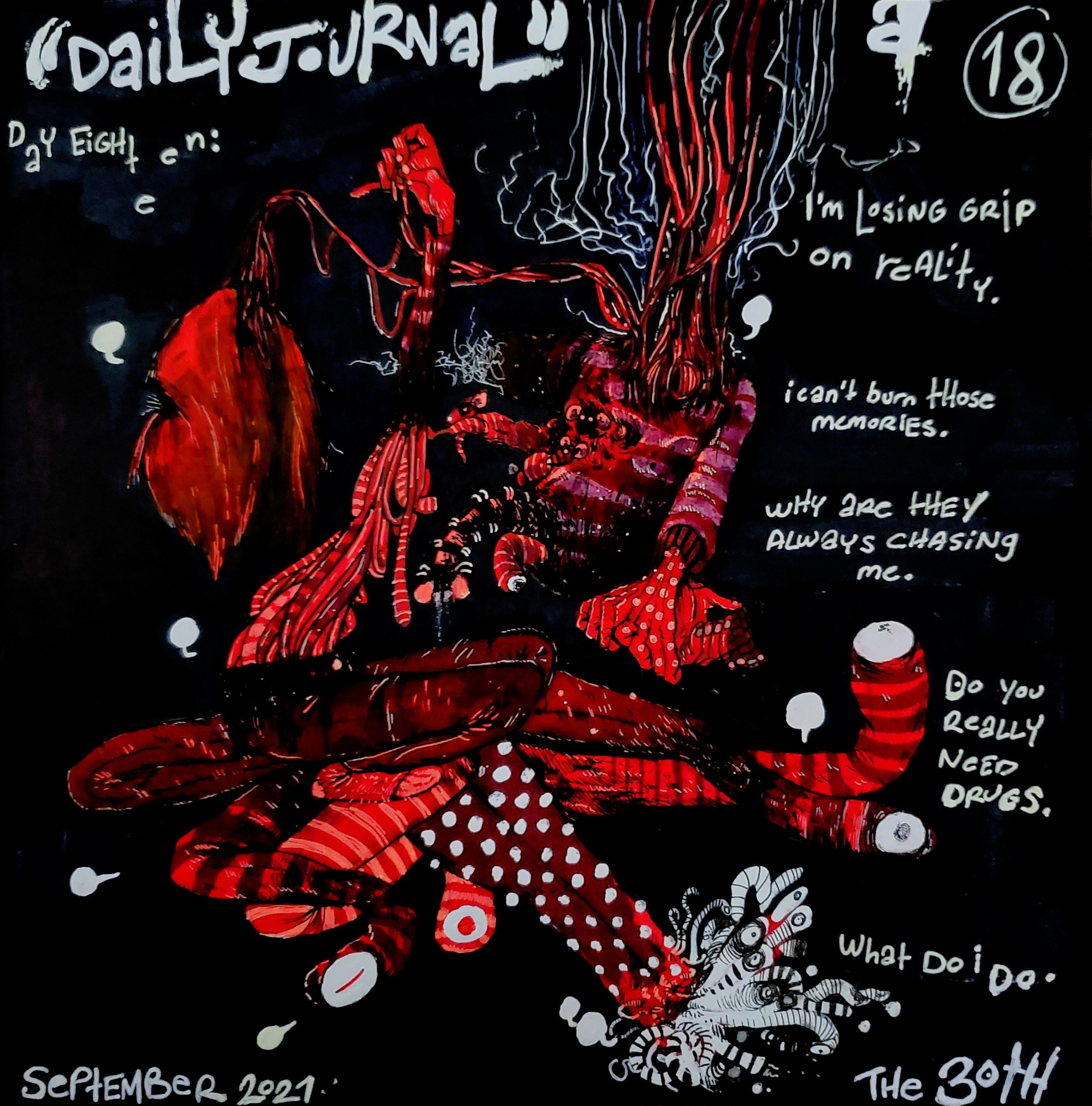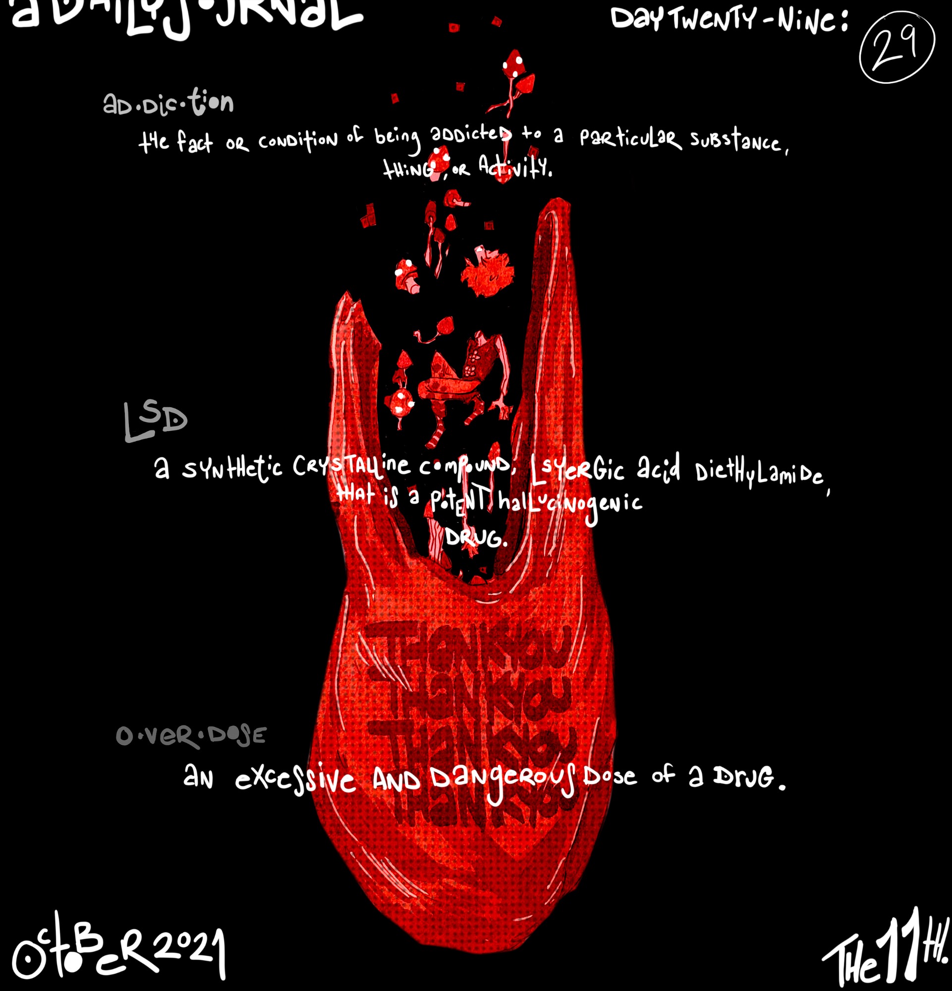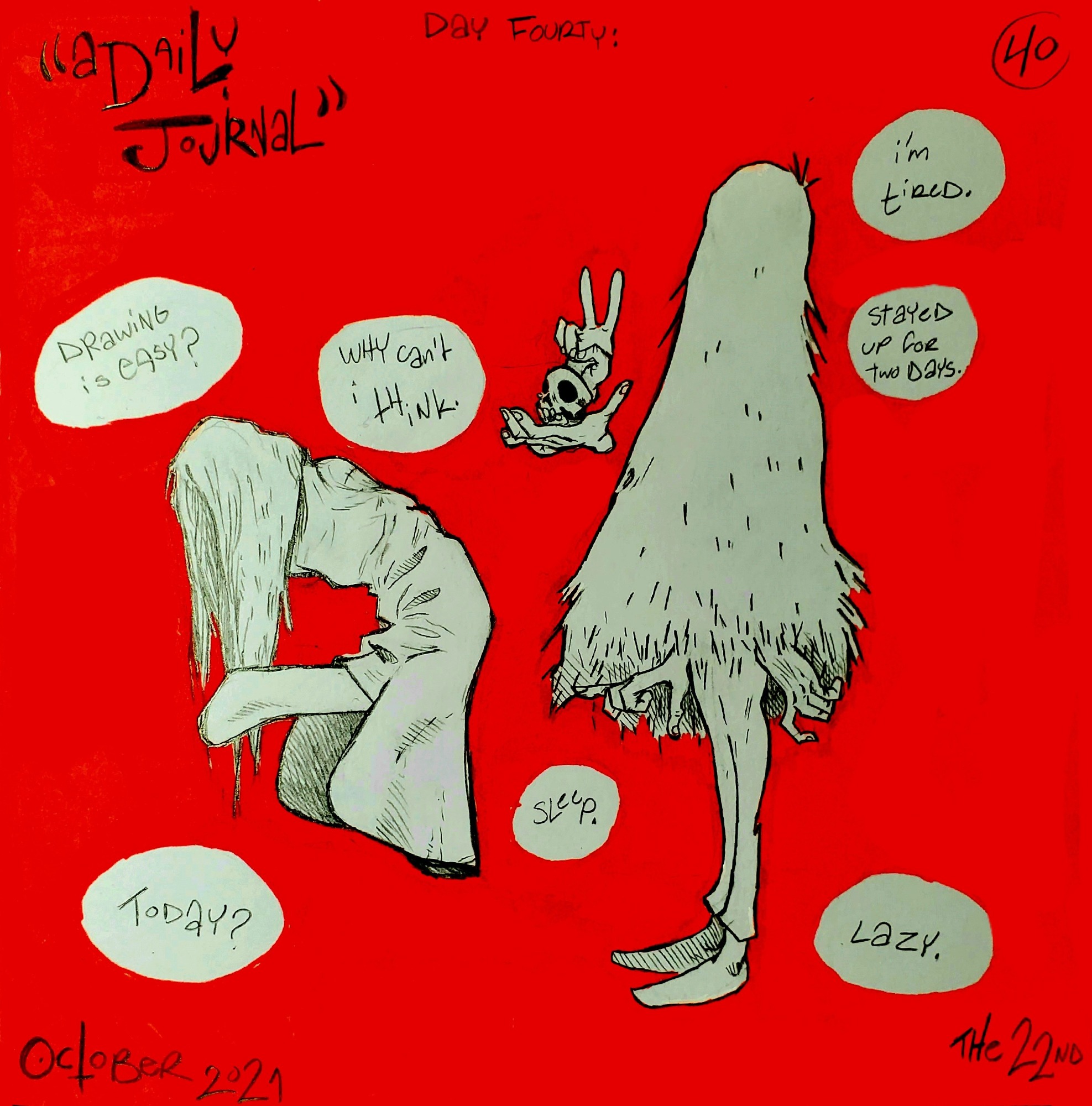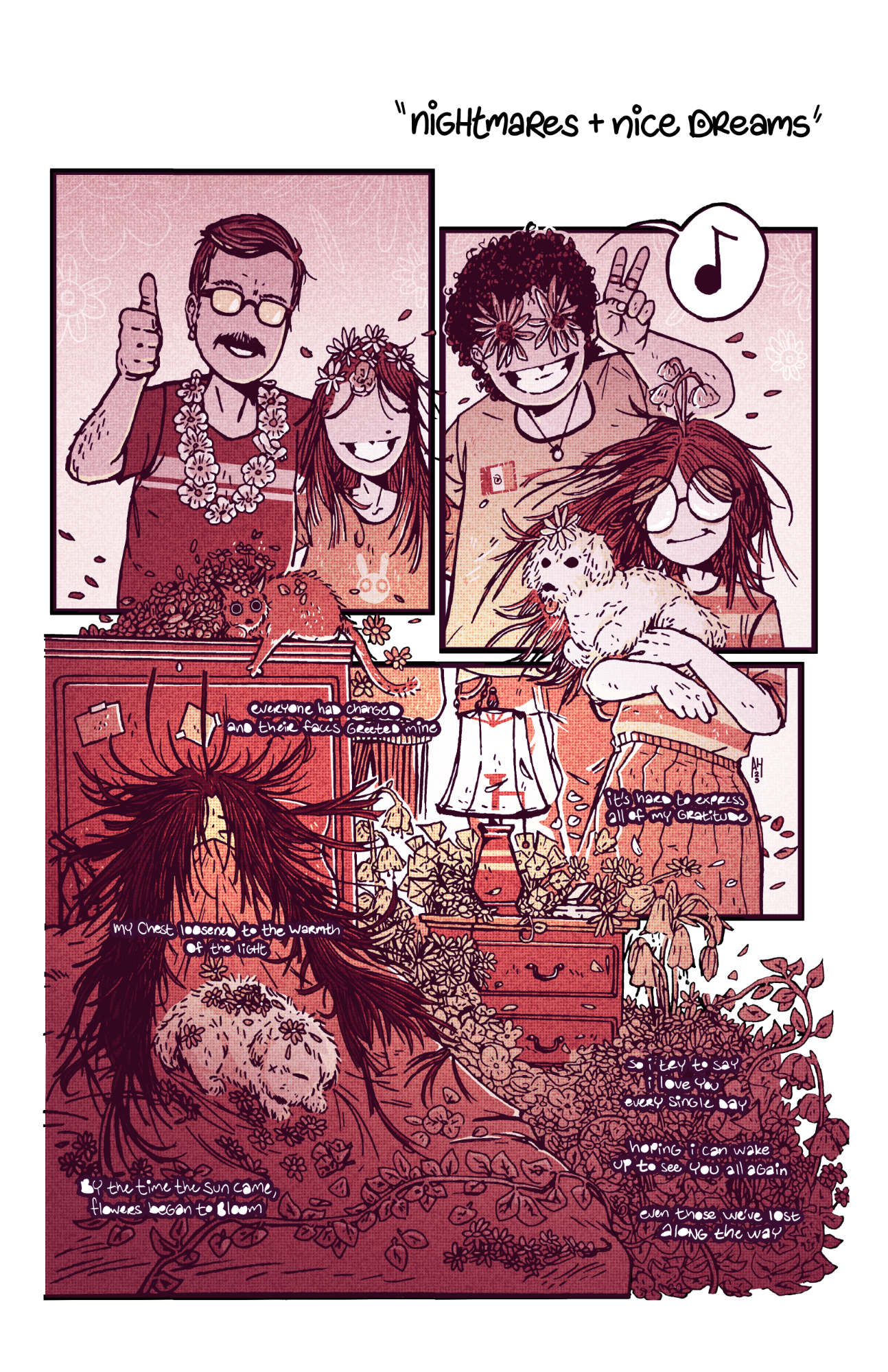 The piece was illustrated to capture the feelings of stress and anxiety I felt in my life, though personified as creatures that I dreamt about at night. I also wanted to capture the relief and happiness I felt in having my family by presenting them surrounded by a mountain of flowers.